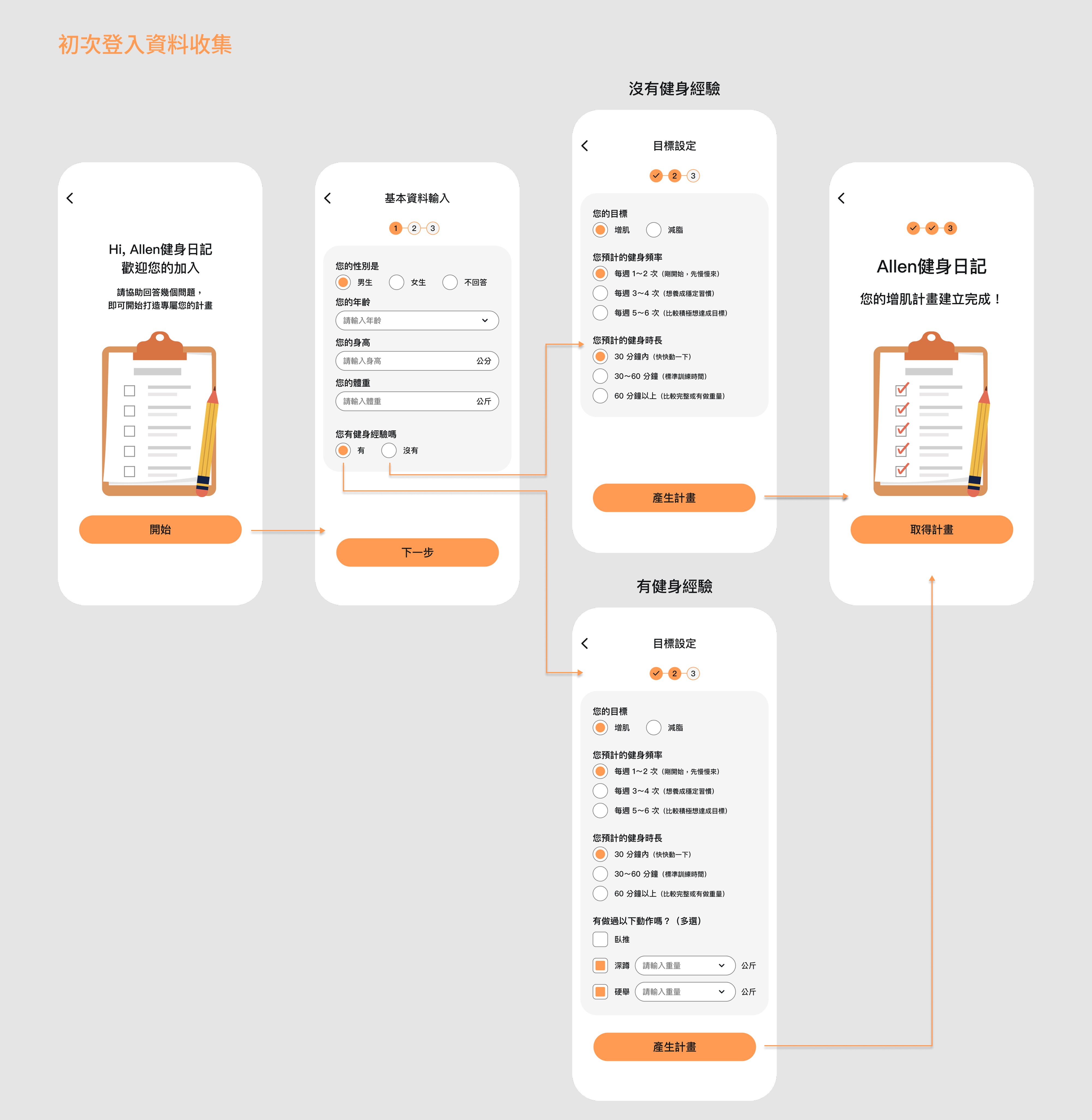 針對新手難以提供精確數據的痛點,我設計了經驗分流機制。透過區隔填寫路徑,新手僅需填寫基礎體能,有經驗者則可設定進階參數,系統透過這些數據自動生成客製課表。排除了使用者因缺乏專業知識而產生的認知阻力,將繁瑣輸入轉化為即時行動指令,解決起步時的猶豫感。