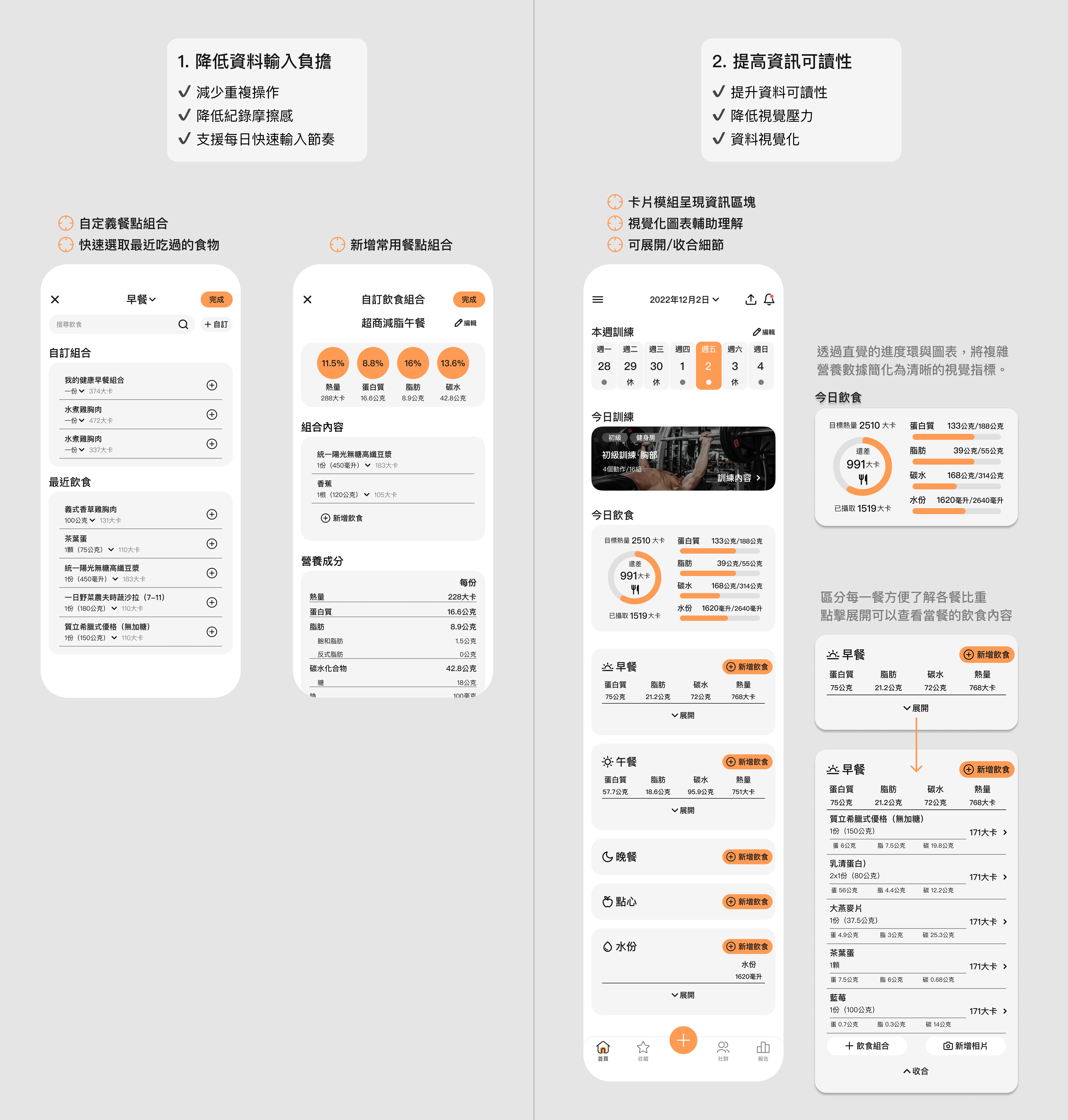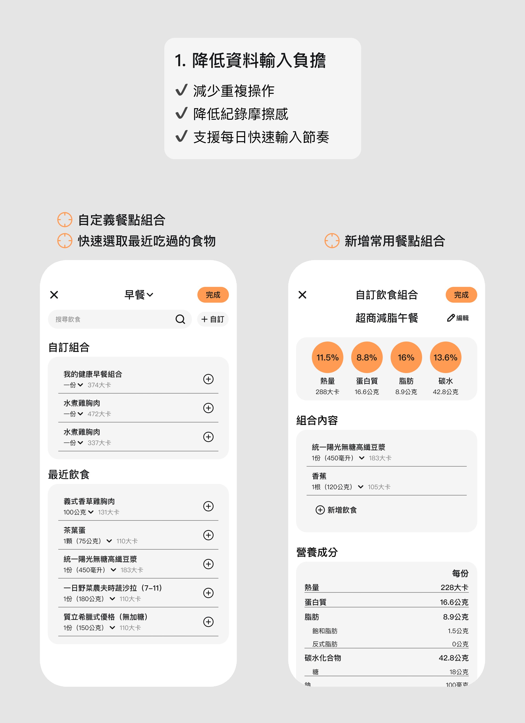 針對飲食記錄的高頻率、低耐性痛點,我重新設計了資訊輸入結構。透過「自訂餐點組合」與「歷史選取機制」,將繁瑣的記錄流程轉化為直觀的點擊動作,有效降低使用者的認知負擔與操作摩擦力。