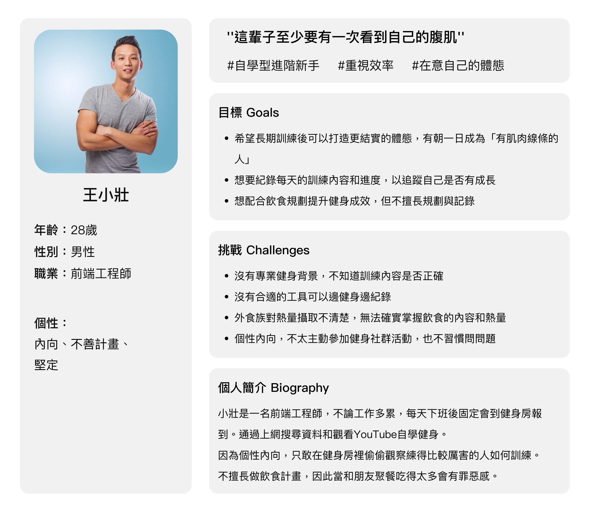健身新手的挫折多源於破碎的資訊鏈與繁瑣的記錄流程。本專案核心在於轉化龐雜數據,透過結構化的介面邏輯降低心理門檻,將碎片化資訊整合為一套有跡可循的成長系統。