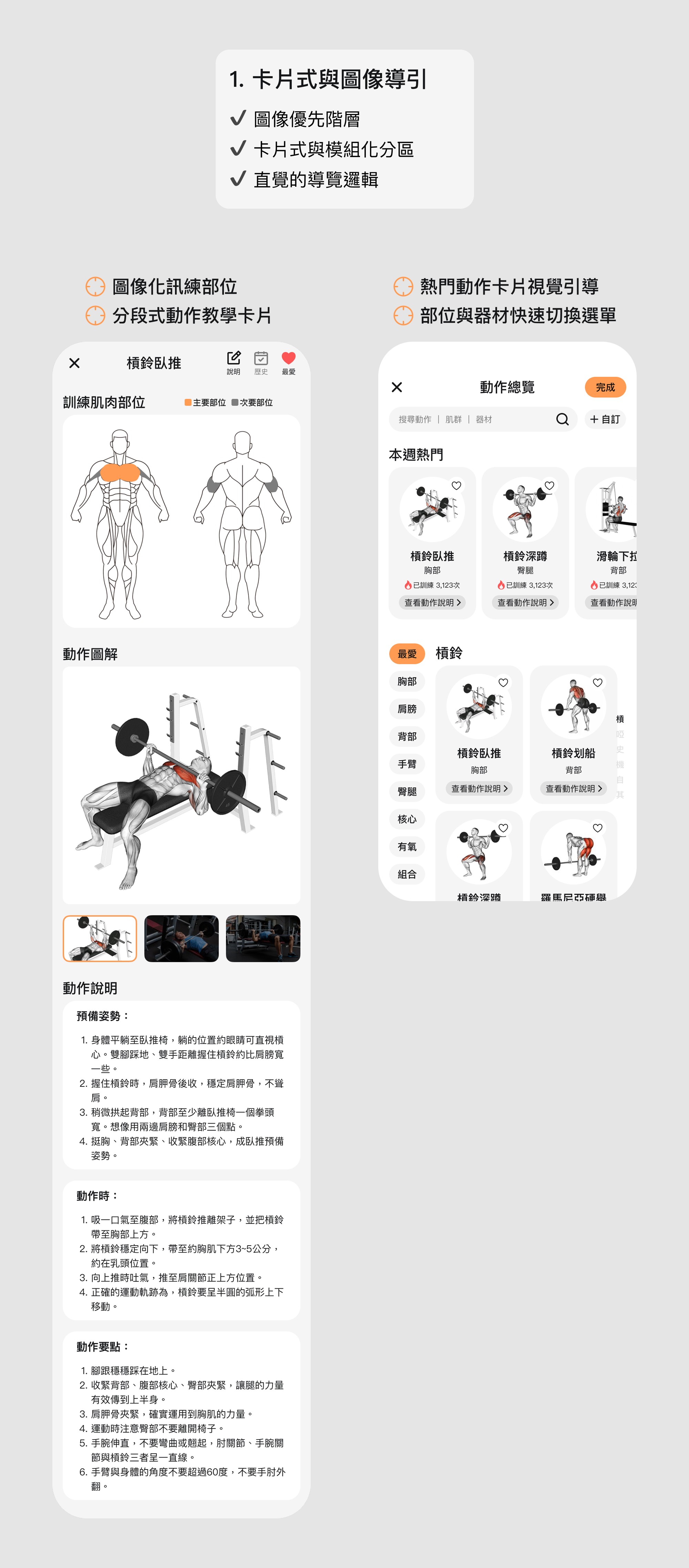 為解決動作理解門檻高的痛點,我將教學拆解為圖像化卡片。透過直覺的人體部位圖與分解動作導引,讓使用者「看圖即懂」訓練重點,無需閱讀大量文字即可精確定位目標,降低資訊負荷。