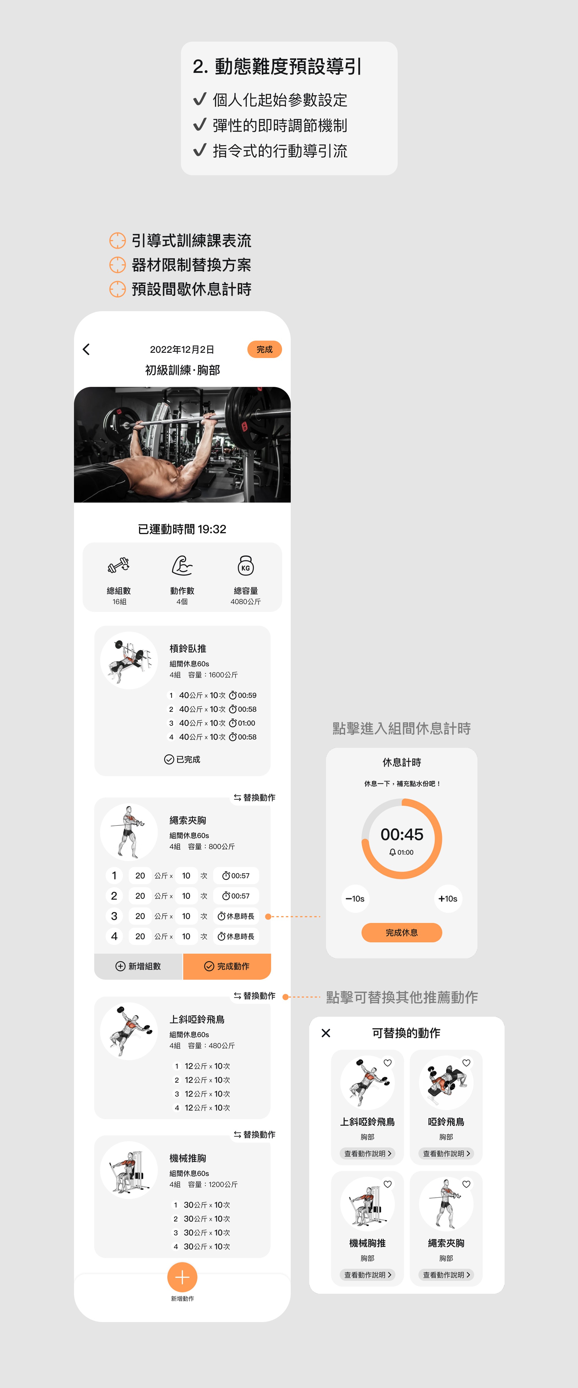 為了讓介面不干擾訓練,我將流程簡化為「指令式導引」。從自動生成的課表到一鍵替換器材方案,並整合組間計時與快速記錄功能。透過降低操作摩擦力,讓使用者專注於動作執行,確保訓練節奏連貫流暢。